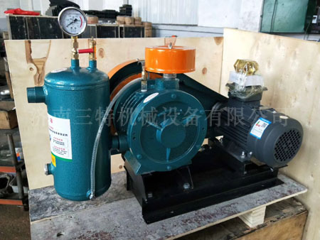 回轉(zhuǎn)式鼓風(fēng)機結(jié)構(gòu)精巧,鼓風(fēng)機壓力范圍:0.1-0.5kgf/CM2。主要由下列六部分組成:電機、空氣過濾器、鼓風(fēng)機本機、空氣室、底座(兼油箱)、滴油嘴。鼓風(fēng)機靠氣缸內(nèi)偏置的轉(zhuǎn)子偏心運轉(zhuǎn),并使轉(zhuǎn)子槽中的葉片之間的容積變化將空氣吸入、壓縮、吐出。在運轉(zhuǎn)中利用鼓風(fēng)機的壓力差自動將潤滑油送到滴油嘴,滴入氣缸內(nèi)以減少摩擦及噪聲,同時可保持汽缸內(nèi)氣體不回流。